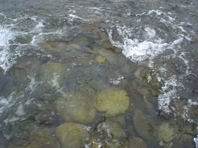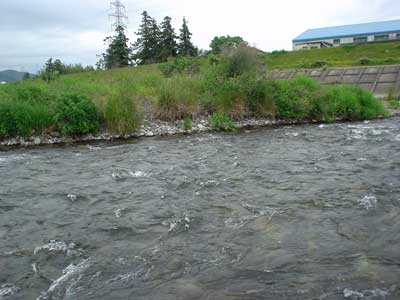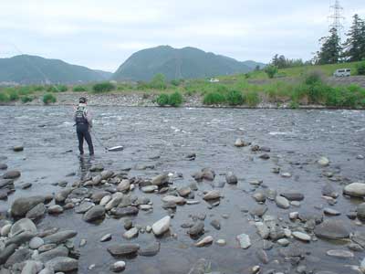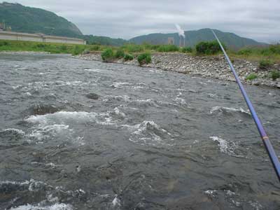 悲観しても仕方ない。さあやってみましょう。瀬を見て上がると瀬肩は綺麗です。右岸に渡り左岸よりの流芯をいきなり引いてみます。養殖では止り辛いですが瀬の中のたるみを探して止めます。1匹目はぎりぎりおとりに使えるサイズ。それを左岸際に送るとすぐに掛かるもこれはビリでエラ掛かりの大出血。これが繋がれば良かったのでしょうけど思い通りには行きません。おとりが弱ると浮き石が多いのですぐに根掛かりします。