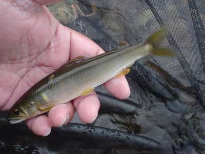昼前から雨が降り出しましたが午後も頑張ってみます。残しておいた養殖で改めて瀬を攻めますが反応が出ません。午前のチビ掛かり鮎に託して性懲りも無く瀬に。サーフィン状態になりますが、スッと入る場所があり我慢しているとハッキリした当たりで掛かりました。やっぱり瀬に居ます。代えて入れますが同じ場所では出ません。少しずらして攻めると小さいながらも追い当たりが出て掛かります。 パターンが掴めて面白くなってきました。しかし小さいおとりを循環させるのは難しい。根掛かりさせると一気に弱ります。するとまた根掛かりして悪循環。川を良く見て入れるポイントを決めて探らないと駄目です。引きずり回して探る余裕なし。同じ攻め方で午後は6匹。全て追いを感じて掛けることができて小ぶりでしたが満足でした。