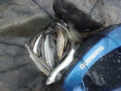 瀬落ちへ移動。ここで粘りましたが2つ追加のみ。後からきたグループの皆さんが瀬のヘチを丁寧に探りポツポツ掛けています。そのお一人がI名人でした。狙い場所を変更してdeibuもヘチを狙ってみます。2匹追加。