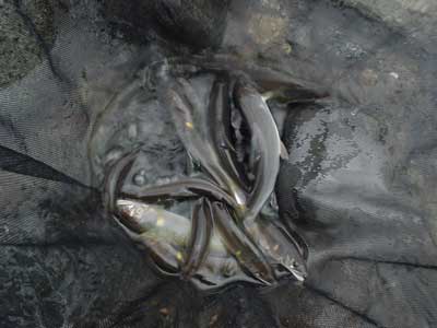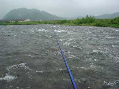 右岸を引いて上がって見ますが反応無し。瀬まで来てしまいましたが掛けられず。気配は充分有りますがおとりを天然に変えない事には相手にされません。瀬を登りきり左岸へ。瀬をだましだまし引いて我慢。やっと当たりが!つい竿を立ててしまうのが早くなりバレてしまいました。 最後の新品おとりを出動するも掛けられず。手がかじかむほど冷たい雨が止みません。お昼を回ったので一旦上がります。榎本さんも追加無し。ラーメンで温まり午後も頑張ってみましょう。