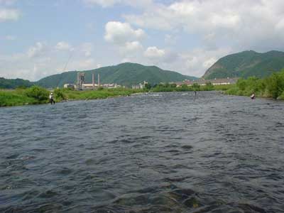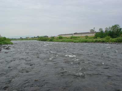 瀬をしつこく攻めるも追加できず。瀬から瀬落ち、開きへ下がり、左岸から右岸へ。広く探るも掛けられず。動いてもダメなので作戦変更。気配のあるところでしつこくゆっくり引いているとやっと掛りました。それからチビ鮎が少し掛かり午前中5匹。周りもイマイチ。