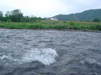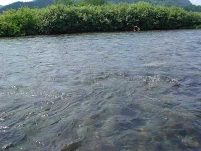 午後は瀬開きのやや波立ちがあるトロ瀬を探ります。糸を立てて上飛ばしするも無反応。引いて動かしても反応悪し。午前中掛かったように止め気味で我慢しているとポツポツ掛かりますが活性は上がりません。