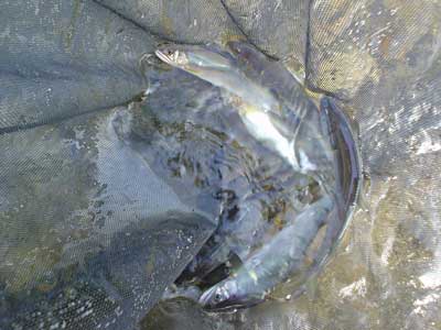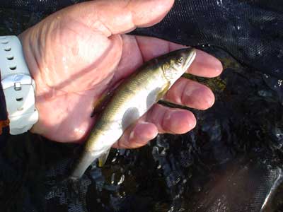 4時頃になり瀬付近で少し掛かりだしたようなので空いていた瀬の上の方へ。ヘチの茶色いところと流れのある白っぽい境目で気持ち良い当たり。16cmほどの綺麗な鮎。これはイケるか!しかしザラ瀬では反応なし。ここまで9匹。なんとかあと1匹。瀬開きで粘ってやっとビリ1匹追加で終了としました。