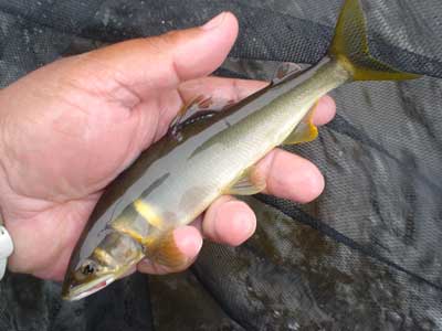 エリア内で昨年下見せず、普段もほとんど入ったことのない木知原(コチボラ)駅裏に午前中は入りました。堤防の上から見ると石色はまだ悪く期待薄。減水でトロのヘチでは鮎がピョンピョン跳ねています。7時から12時までやって5匹。鮎は居ますが掛けにくい。ここでの下見結果は「このエリアを絶対引かない」となりました。増水すればチャラが狙い目か?
