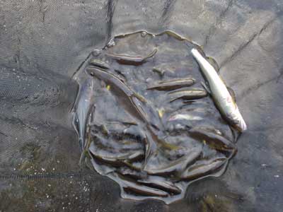 午後は決勝の舞台となる漁協前へ。いつも混雑しているのでほとんど入ったことが無いエリアです。金蔵さんがちょうど上がるところだったので聞いてみると良い所では良く掛かっているらしい。見ている間にも良く竿が立ちます。ここでは6時過ぎまでやって26匹。競技時間終了後の夕方良く掛かりました。夕食みの鮎は放流魚のまっ黄色でサイズも良くいい鮎が掛かりましたが、その他はやや白い鮎か黄色い鮎は小型だったり痩せていたりの2番、3番、5番鮎くらいです。白い鮎は同じところで何匹も固まっているので良いポイントなら出る出るになるようです。