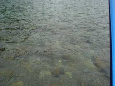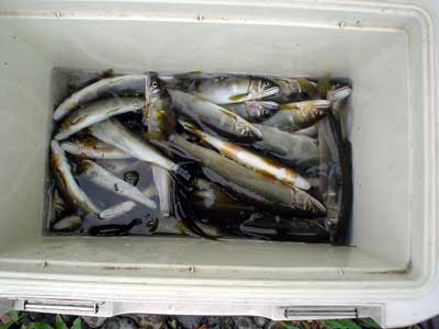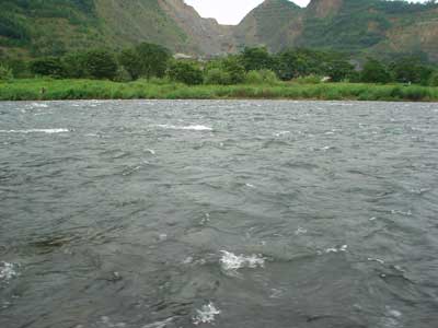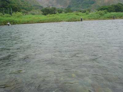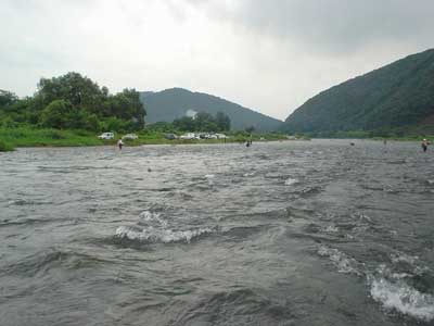 7時から開始。土曜はすごい人出だったそうなので流れのきついところを選んで探っていきます。サイズは良かったですが単発で午前中8匹。午後はやり始めてすぐに1匹目。しかし出血で使えずそれから5時まで1匹も掛けられず!真剣にやったつもりなんですが・・・なにかが狂っているようです。斉藤さんは51匹!まあ全体の中でも群を抜いていますが。頭を丸めたい気分です。 |