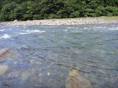 | 多雨の梅雨から1日で真夏に変ってしまい、鮎も大変です。新垢を期待して安曇川へ行ってみました。今回はヒデVさんも一緒です。 前回と同じ古川へ。行ってみると古川が「新川」になってしまっていました!流れが激変しています。下の瀬はなんとなく原形を保っていました。降り口付近は石も白く不安がよぎります。新垢はどこから付くのか。浅い所からかと思いましたが意外に水深と大石がある所で新垢が付きだしています。瀬のヘチで開始しすぐにビリ。ビリが良く泳いで瀬に入ると1発でギューン!瀬で掛かるのか。入れ掛かりにはなりませんがポツポツ掛かりました。サイズも良く、意外に痩せていません。引きも強く面白い! 更に良い場所を探して大雑把に竿を入れて行きます。瀬の落ち込みでも良く追います。流れの一番強い所はダメで、少しでもブレーキが掛かっているようなポイントに垢と鮎が付いている感じ。前回のように中石のザラ瀬では掛からず超入れ掛かりには程遠いです。大きめの石の前、横、後ろと探って掛かる。浮き石も多く吸い込まれてしまうことも多く、予防のため強めに引くので余計に掛かりにくいようです。 お昼は木陰でまったりと休憩。日差しは強いものの風は爽やかで気持ちの良い日でした。午後は降り口から上流へ行ってみます。前回の入れ掛かりポイントは掘られて巨大な岩盤が出ていました。ここでも大きな石周辺や、水深のあるやや緩い流れで掛かりました。でも平均午前の瀬より小型でした。下りながら様々なポイントに竿を入れて行きましたが結局掛かったのは朝の瀬。最後は根掛かりを外しに行って、大石をまたいだつもりが足が届かず流されて泳いで終了でした。汗が流れてさっぱり!鮎は多いので新垢がしっかり付けば何処でも掛かるようになるのでは?来週あたりが狙い目か? |