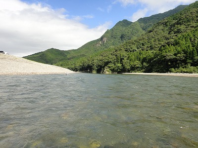 | 今週は月曜がお休み。単独で土日に散々叩かれたであろう熊野川へ。熊野川へ通ううちに色々改善点が見つかってきます。まずは帰りの運転が眠くて辛いので前の晩から乗り込むことに。20:30に鈴鹿を出発。のんびり走って浪花統八さんの前の道の駅には23:30頃到着しました。ビールを1本飲んで就寝。6時までゆっくり寝られるので楽です。 5:30に浪花のおやじさんが竹ぼうきで掃除をする音で目が覚めました。これは楽です。ゆっくり朝食を取り川を見るとダムの濁りもすっかり取れて綺麗な熊野川です。おとりと今日の発電放水予定を聞きます。「浪花統八」さんって屋号かな?と思っていたんですが表札がそのまま「浪花統八」さんになっています。フルネームだったんですね。ここのおとりはいつも文句なし。あちこちの河川へ行きますがトップクラスです。浪花さんに教えてもらったんですが、発電放水もテレホンサービスがあったんですね。それ(0120-201-914)によると今日は9:00に16t、その後段階的に増えて11時に最大の75tです。水位で言うと場所にもよりますが概ね30〜40cm増えます。朝のうちはなるべく沖を探ってみるのがセオリー。増えたら手前です。ちなみに降雨による放流は0120-302-425で聞くことができます。 さぁて、何処へ入ろうか?とりあえず三和大橋まで行こうと出発。浪花さんから少し走ると道路が左にカーブする所で正面に良い瀬が見える場所があります。鎌淵の瀬の下です。以前ハルさん達と見には来ましたが竿は出さなかったところ。とりあえず見てこよう。行ってみると石色は良い感じ。水位が低いのでこれなら出来そうです。まだ7時前。ダメなら移動すれば良いのでやってみます。上のトロから平瀬が100mほど続く場所ですが、終盤に馬の瀬があります。その周辺から探ってみましょう。 釣り人の足跡は沢山あります。すねほどの水深の馬の瀬の中で少し深くなっている筋に入れ、落ち着くとすかさず当たり!様子見のためイニシアの6.75を使っていたので慎重に、しかし場も荒らしたくないので下がらずと耐えていたらロケットです。まあ掛かるのが分かったので針をバレン8号3本錨にして再度流れに入れると掛かりました。18cmほどの良い鮎。しかしやや待たないと掛かりません。それに1級ポイントでも小型が掛かってくる。当然ですが土日に触られているようです。 熊野の場合、前に出ながら川を横に探ります。掛かればその上下を探り、当たればその筋を重点的に攻めます。瀬全体に掛かれば良いですがまずそれは期待薄。広い瀬のどこかにある入れ掛かりスポットを探せ、探せ!です。今回は馬の瀬の向こう側に反応が良い所がありました。最初に黄色い良型が掛かったので期待大。このころ上流でブルが動いているようで濁りが入ってきました。熊野川、北山川はジェット船が通るエリアで水位が下がってくると航路を確保するため大きなブルトーザーで川の中をひっくり返して掘り下げます。作業は水位が低い朝のうちにやるんです。これをすると当然やった場所は白川で当分駄目。その代り垢腐れ気味の時はそこが新垢付いて入れ掛かりになる場合もあるそうです。今回はそのうっすら濁りが吉と出たのかスイッチが入ったように入れ掛かりになりました! 丁度その頃ヒデVさん合流。なぜここに居るって分かったの?「見えた」そうです。この頃がピーク。掛かる鮎も18〜20pで22p級が混ざる感じ。こんな状態の瀬が2人で貸切!どうなるかと思いながらしばし入れ掛かりを楽しみました。 少しづつポイントを上にずらしながら攻めていくと段々深くなってきます。膝程の水深の所で良く掛かったんですが、又下程になると追いが悪い。同じように見えても瀬の中の駆け上がりで良く追ったんですね。9時を回って水位も少し上がりそれ以上沖は大変。瀬肩付近では当たりが遠くポツポツ。10時過ぎまでここでやって、丁度目標にしていた40匹を早くも達成!熊野川のキャパシティを実感させてもらいました。 次は前回楽しんだ音川尾頭前の瀬の右岸へ。ここは失敗。ここでブルが川を掘っていたようです。やりたかった瀬の上はまっ白。その下の瀬も薄っすら泥かぶり状態。小型が2匹ですぐに見切り。 ヒデVさんは小船へ。deibuは欲を出してまた新規ポイントを探しに行ってみます。漁協のサイトで見た「小鹿の瀬」を見に行こう!川へ降りる道を進むとなんと本当に小鹿が!夜は良く見ますが昼間もウロウロしてるんですね。これは幸運の小鹿か!しかし「瀬」らしきものはほとんどなくUターン。前回できなかった「鎌淵の瀬」へ。大きなトロ尻にびっしり石が入っているのが道路から見える場所。昼食を摂っていると激しいスコール。全然寒くない雨に濡れてゆったりとトロ場を楽しもう!オモリ無しでスーッと送り出すと反応があるものの掛かりません。オモリを付けて再度。ギューン!水深があって流れも結構あるので底に入っていなかったようです。ポツリポツリですが掛かってくれます。ここでは針に悩
