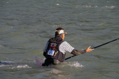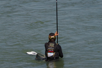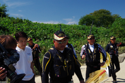 〈第2試合〉 第2試合のおとり配布頃になると強い日差しが選手たちに降り注ぎだした。気温は一気に28度まで上がったが、水温は15.5℃といまだに低い。風は強いものの日差しが強くなるにしたがって弱まるはずだ。状況としては上向くのではないかと皆が期待した。 |