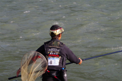 ![]() 初参戦でこの九頭竜川の状況は過酷だったに違いない。本来の九頭竜川であれば父譲りのおもりを使った瀬釣りが輝いただろう矢吹選手だった。 |