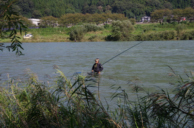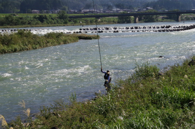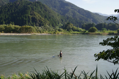 ![]() 島選手が立つ下流には九頭竜屈指の瀬が誘っていたが、攻めるタイミングを逸してしまった。 |