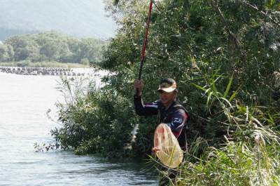 ![]() 横山選手が暴れまわる状況ではなかった九頭竜川だったが、師譲りのナイロン糸による繊細なおとりコントロールで掛けていった。 |