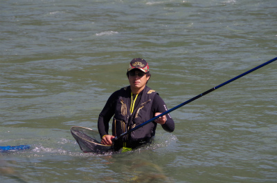 今大会の本命でもあった小沢聡選手。ジャパンカップを4度も手にした男の凄さを第4試合で垣間見ることとなった。 下流エリアBブロックの分流に入った小沢選手は、残り30分からパターンを掴み釣果を伸ばしていた。このポイントから検量場所までは川から上がってから8分ほどを要する。河川敷なので最悪竿は伸ばしたままでも帰ることはできるが、他の選手は試合時間を5分ほど残して竿を仕舞い戻っていった。 小沢聡選手も残り3分となりおとりを引き戻した。これで仕舞うのだろうと思ったら引き船から違うおとりを選び出している。間に合うのか。帰着の猶予は終了後10分だ。その焦りを見せることなく小沢聡選手のバーサトルは狙った位置におとりを滑らせていく。試合開始時と全く同じ釣り姿。残り1分。ククッと竿先が曲がり2匹の鮎がタモに吸い込まれた。ここでホーンを聞き川を上がる。竿を仕舞う猶予はなく、 |