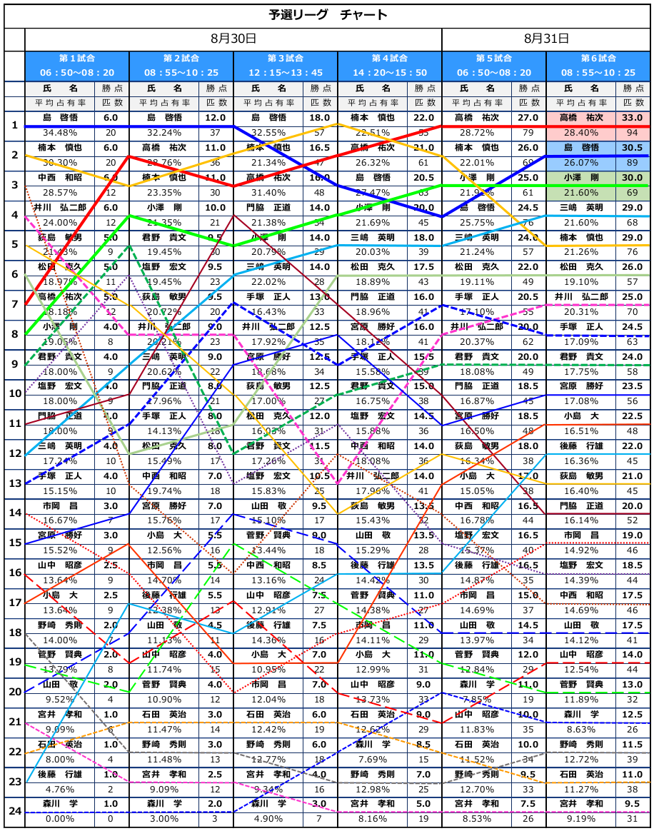 | 第6試合 | 試合日:8月31日 | 1 | 後藤 行雄 | 10 | 1 | 島 啓悟 | 13 | 1 | 高橋 祐次 | 15 | 1 | 宮原 勝好 | 8 | 第6試合合計185匹 一人平均 7.7匹 ブロック平均46.2匹 |