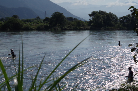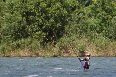 ![]() 高橋選手の華麗な九頭竜返しをどうぞ! @立ち位置から下流に送り込んだおとりを引き上げて行く。この時点 ではおとりはまだかなり下流に居るが、一番沖へ出た状態だ。 この手前から沖へ出て行くところで掛かることが多いようだった。 |