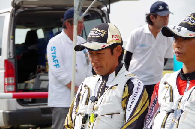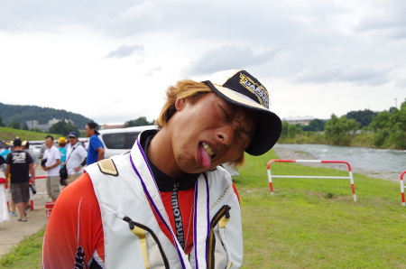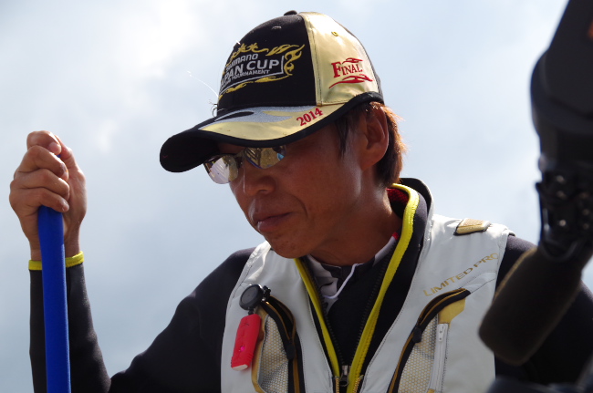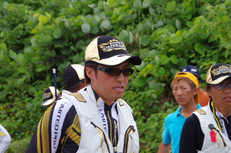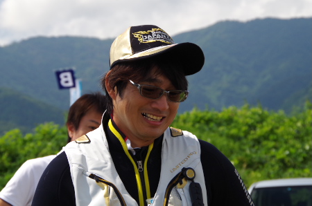 対して高橋選手はシモツケのブラックバージョンファイターという剛竿に2〜3号のおもりを常用、タモも九頭竜の川漁師から発想されたという「激流振子 巾着網」、サイズも水流抵抗の少ない25DRを用意していた。目印も付けていない。このタックルで挑むには、まず急瀬の中で安定して立つことが前提だ。ふらつけば即トラブルにつながる。今大会参加選手の中では急瀬の立ち込み、移動、取り込みは一番安定していた。 その高橋選手の探り方は立ち位置から下流へおとりを送り込み、自分が中心の扇状におとりで底を掃くように引き上げて行く。引き上げきったら少し立ち位置をずらして繰り返す。見ていると自分の正面に来るまでに掛かる場面が多かったようだ。この釣り方のメリットは何と言ってもテンポの速さだ。おとりが動く距離は島選手よりも多かっただろう。 このテンポを持続するには取り込みも重要だが、完成された九頭竜返しで危なげなく取り込んでいた。掛かり鮎が水面を割ると竿のパワーで一気に上流方向へ飛ばす。飛ばすと瞬時に竿先は下流方向へ。穂先はすでに上流へ向いて曲がり、スピードと方向をコントロールしている。それとともに体勢はそのままで、顔だけを動かし視線で鮎を確認しながら鮎よりも先に着地点を見据えている。竿、体勢、着地点の見極め、全て鮎より先に整っているので狙った位置に極めてスムーズに掛かり鮎が着水する。体が上を向かないので体勢も崩れない。あとは理想的に流れてくる鮎を振子タモにつるしこむだけだ。この一連の動作を淡々とこなして釣果を重ねて行く。 しかしそれだけが強さの秘密ではない。例えば今回のDブロックでは右岸側へ渡れば竿抜けの可能性が極めて高いポイントが広がっている、しかしそこへたどり着くには九頭竜川の奔流を泳ぎ渡るしか術がない。もちろん渡れば帰ってくることも必要だ。高い渡河技術を持った他の選手達でもそのリスクを考え諦めた戦術を何の迷いもなく選択し実行する。九頭竜川の鮎を如何にして攻略するのか、だけをストイックに追い求めた結果からの行動だった。そうかと思えば釣り人の多かったCブロック、飯島エリアでは居並ぶ一般の釣り人の間を探るのではなく、幾筋にも別れた流れに中にもある強い流れに立たなければ攻められないポイント、釣り人が多いのに竿抜けとなっているポイントを的確に攻め、一般の釣り人とは異次元の釣りを展開していた。 今回の九頭竜川では追う鮎が強い瀬にいた。だからそこを攻める。強い瀬を攻めるにはこの道具立てでこの釣り方、考え方は極めてシンプルだ。高橋選手と言えば京都上桂川で鍛えた泳がせ釣りのイメージも強いが、その河川、その時に追う鮎がどこにいるのか。浅いチャラやトロならそこを狙う。その時はどういった攻め方が適切なのかを判断し、一番効率が良いスタイルで釣る。それが高橋選手の強さだろう。そして昨年あたりからその強さが際立ってきた。TV、DVDや実際に見た釣りスタイルが、以前と大きく変わったようには見えない。なぜ安定して強くなったのか。そこを聞いてみると結果に固執せず、ダメでもその事実を受入れ、思考は次を向く。もちろん失敗も引き出しには蓄積されていく。しかし次の試合ではまたそこに潜む鮎を如何に掛けるかに集中する。常にポジティブに考え、動く。それがここ最近の強さの源のようだ。プロフィールインタビューで、今年のマスターズ優勝でさえも「過去は忘れた」と言い放つのは、あながちリップサービスではなく、今の高橋選手の強さを端的に表す言葉だったのかもしれない。しかし今大会では、表彰式も終わった帰り際にはあっさりとはしているが、負けた悔しさを目いっぱい表してくれた。次はさらに強くなってくるだろうと予想させられた瞬間だった。 |
