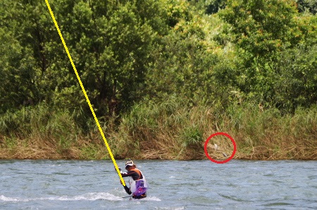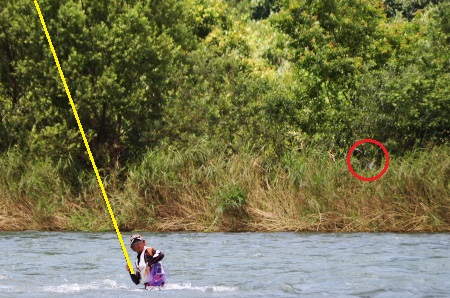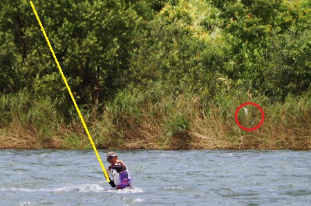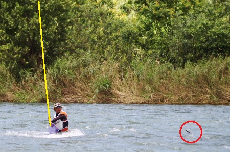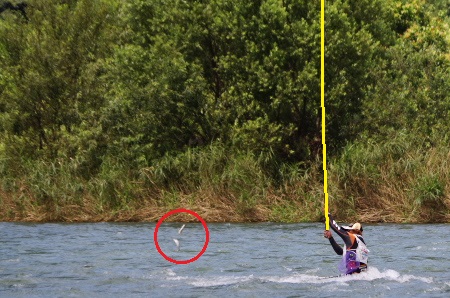 ![]() A野鮎が掛かると遊ばせることなく素早く浮かせる。 このタイミングが遅れると高橋選手でも付いて下がることを強いられる。 竿のパワーも要求される。 ※竿のしなりが良く分かるように黄色く表示します。 |