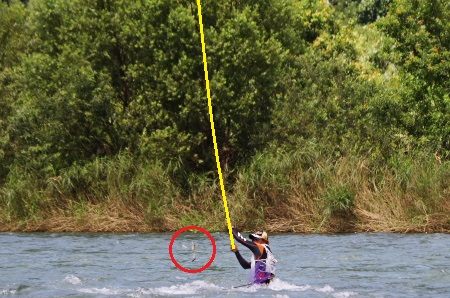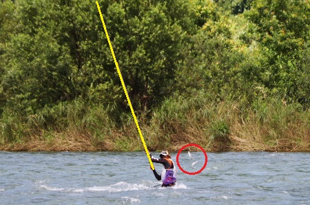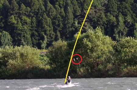![]() これは一般の方の九頭竜返しだ。掛かり鮎の位置は左の写真とほぼ同じ だが、竿先の位置はこんなにも違う。竿のパワーと腕力で抜くとどう してもこのような軌道を描く。ラインは完全に弛んでいるのでこの時点 ではコントロールできてない。 |