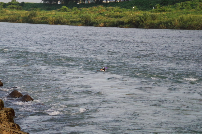 ![]() H理想的な位置に掛かり鮎が着水した時にはすでに体勢は整っている。 あとは流れてくる鮎をキャッチするだけだ。@の写真と比べても 立ち位置はもちろん、腰から下の向きは変わっていない。これなら 水流に体がぐらつくこともない。 |