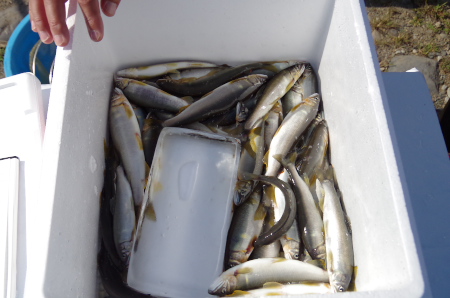![]() 今大会で掛かった九頭竜の鮎。18〜22pほどの良い鮎が多かった。 大きいものは25p級だったが、思ったより割合としては少なく感じた。 |