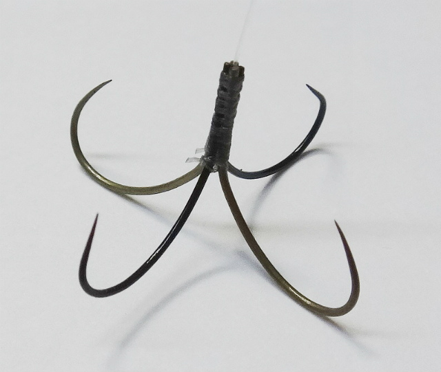 ![]() 島選手の勝利した針。段針と言う。色々な組み合わせがあるそうだが、これはしわり系が8号、ストレート系が7.5号の針を対角線上で組み合わせている。針先が隣り合う針と「段」になっている。イメージは鮎に当たった時には1本の針が当たった方が刺さりやすい。しかしキープ力は2本がしっかり刺さった方が良い、という発想から考えだされた。使い始めてこれで4シーズン目にもなるそうだ。 |