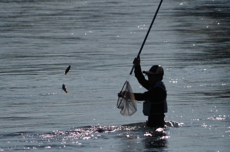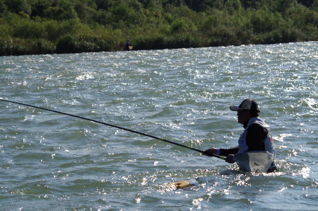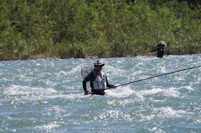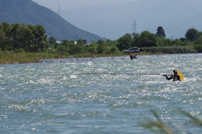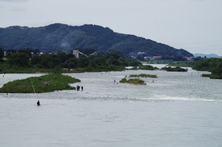 ![]() 九頭竜川は最高潮を迎えて多くの釣り人で賑わっていた。激流のイメージが強い九頭竜川だが、年配の釣り人達も思い思いの釣り場に立って、十分満足な釣果を上げている。懐の深さもこの川の大きな魅力だ。 |