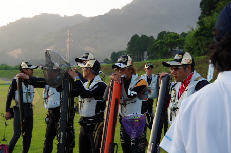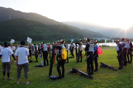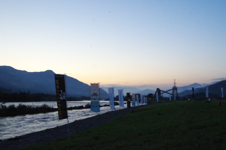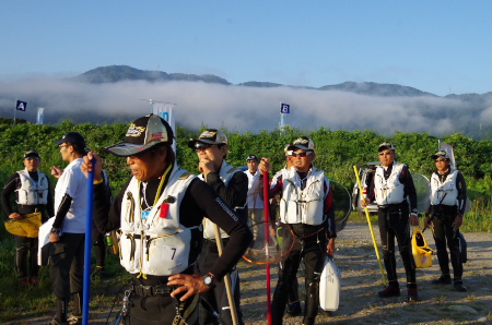今回は大会本部が永平寺の燈籠流しが行われる「谷口」の河川敷に移された。昨年のジャパンカップでは決勝戦が行われたエリアだ。朝特有の海へ向かって吹く風が川べりに立てられた多くの旗を揺らし選手を歓迎した。戦闘状態で集まった選手は各ブロック別に整列しバンで移動する。ここに戻るのは2回戦を終えた後だ。非常に重要な序盤2戦を思うように戦い戻ってくる選手は誰か。 |
