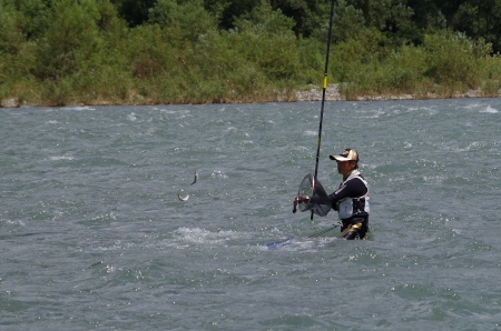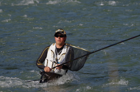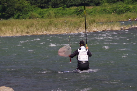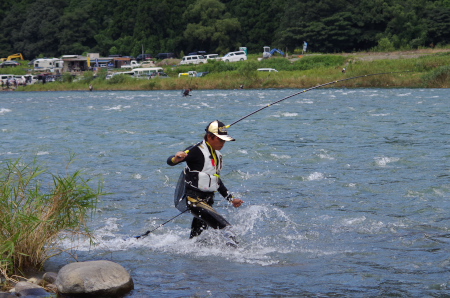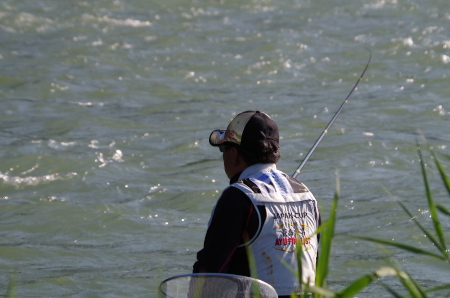 ![]() 坂東島の瀬を攻める島選手。今大会で以外にも一番釣れなかったこのBブロックであるが、釣る人は釣っている。 攻め方で大きく差が出た証拠だろう。九頭竜川坂東島のスペシャリストとも言える岐阜のNさんは、この日も ほぼこの写真に写っている範囲の右岸側だけで、73匹の釣果を得ていた。キャパシティは十分にあるが、攻略 は難しい。 |