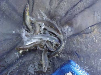 天気の回復にあわせて釣り人も増えてきました。贅沢に河原ですき焼きをご馳走になり暖かくなったのでもう一度挑戦。水温は17度ほどまで上がったようです。瀬頭周辺を攻めてみます。オオッ!追われます。逃げて戻ったところでツツツッと掛かりました。小さいですが背掛かりです。おとりが変わると正直なものでぽつぽつ掛かりだしました。小さいおとりと風で非常に操作しづらいですが1時間ほどで9匹。日が傾きだすと一気に寒くなってきたので上がりまた。更地堰堤上も遅くまで皆さん竿だししていましたのでそこそこ掛かったのかもしれません。