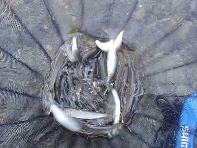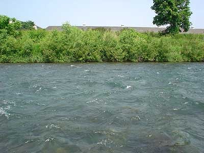大野橋上に入ろうと思いましたが7時半頃にはもう釣り人が。漁協でおとり調達、そして7月20日に開催される第1回根尾川鮎釣り大会の申し込みを済ませ、解禁に入った更地堰堤しもに行きました。解禁日より15〜20cm水位が高いですがちょうど良い感じ。濁りは無し。8時に開始。左岸瀬肩ヘチからそっと出すとすぐに1匹目。やや色付いていたのでこれは!と思いましたが・・・掛かり鮎が腹掛かりのわりには元気に泳ぎまたすぐに当りが。でも掛かりません。もう一度ケラレてしまい落ち着かなくなりました。これで1時間頑張るも追加できず。最初の養殖で探りますが攻められません。廻りも掛からないのでもう1匹のおとりは温存しておきます。石色は良いし鮎も走ります。