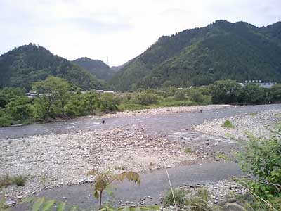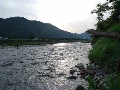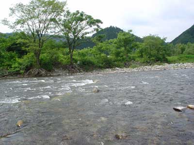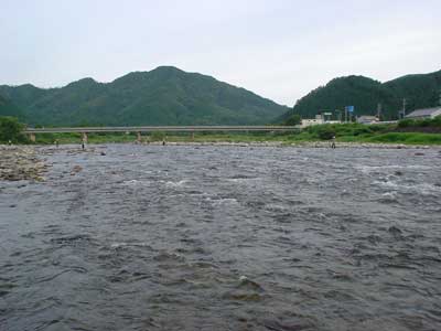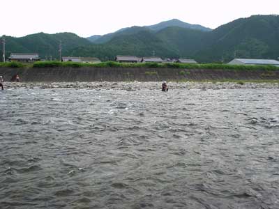 さておとり配布を受け「徒歩」で上流へ。睦橋下流の瀬右岸木の下に入ることができました。初めての場所ですが、06年の大会時、ここに入ったN名人が良く掛けていたのを見たからです。しかし今回は減水で実際のポイントを見ると石が無く砂地です。06年のやや増水時とは全く違う状況。しかし結局鮎が溜まる場所は同じはず、と信じここでやってみます。上に木があり注意が必要。6時10分に競技開始です。なかなか掛かりませんが廻りも掛かっていません。たまに掛かるのも小さい鮎です。我慢です。1匹目は開始1時間になろうかというとこで掛かりました。どうも砂と石の間を小さな群れが移動しているようで着いて動きます。結構早い動きなのでこれは掛かると思い同じ場所で粘ります。瀬で掛かりだせば勝負に出ようと考えていました。しかし3匹掛かって群れが移動したのか反応が無くなりました。