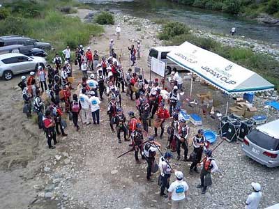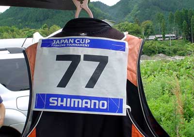 さていよいよシマノジャパンカップ予選です。今回は255名とかなりの参加人数で早朝4時頃にはお祭りのような賑わいです。どきどきの受付でスタート順を表すゼッケンを引きます。希望通りの二桁77番をゲット。この時点で上流域へ行こうと決めました。勝負服に身を包んだ選手が整然と並び競技説明を聞く様子はいつ見ても緊張感を煽ります。