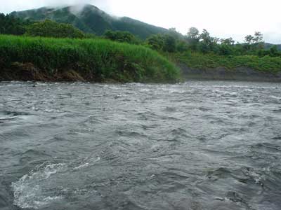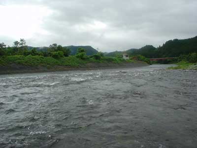 朝は斉藤さんからの電話で起こされました。「出来そうか?」「たぶん無理」と言ってから川を見ると?以外に増水していません。濁りも無し。榎本さんも美濃から移動中で結局3人で朝食を取ながら様子を伺います。レーダーを見るともうすぐ雲は切れそうです。しかし活かしておいた板取の鮎が全滅!しかし1匹だけ元気です。未使用の養殖だけピンピンしています。
