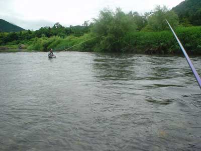 これを持って榎本さんが突撃。斉藤さんは道具を取りに家に戻りました。瀬肩を陣取る榎本さんを車中から見ていると、掛けた!ほぉー、居るんや。また掛けた!結構デカイやん!鮎モード点火!雨も上がって突撃!榎本さんからおとりを強奪!ここで掛かれば入れ掛りやっ!という瀬肩パンツへおとりを滑り込ませました。1、2、3で掛かるはずが・・・