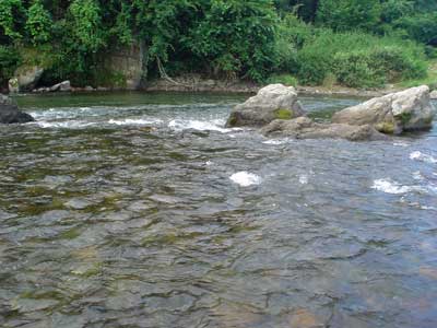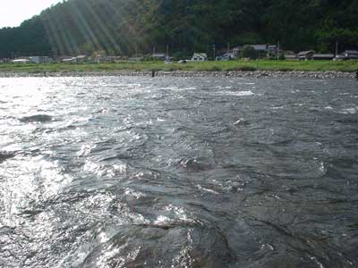 朝最初に入ったのは瀬の最上段です。昨年良く掛かったので行ってみます。行ってみると水位が低くて昨年のイメージと随分違います。右岸には先行者があったので左岸のほうへ渡って大岩の付近で水通しの良さそうなところへおとりを入れるとすぐに掛かりました。今回は細糸で瀬でも泳がせることを意識することが課題です。瀬の中でもおとりが止まるところを探して一瞬でも糸を立ててみます。2匹目もすぐに掛かりましたがこれはバレ。入れ掛かりで20cmほどの良い鮎を今度は確保、その後2回続けて空中バレ。これは掛かるわ!と思ったのが大間違い。それから大沈黙。やや深いところで一度バレたのみ。廻りも掛かりません。軍艦岩のあるところまで下り、川の真ん中に居たO原さんの隣に入って右岸側を狙ってみると小型が掛かりました。それが上手く泳ぐと簡単に掛かって5匹入れ掛り。今回は当番でお昼の準備のため11時で午前の部終了。7匹と絶不調。午前TOPは和人君の15匹。