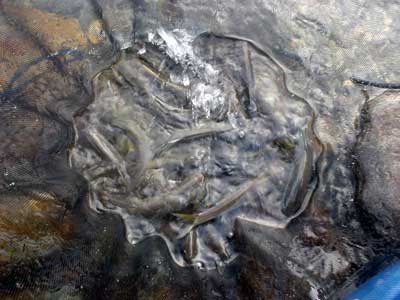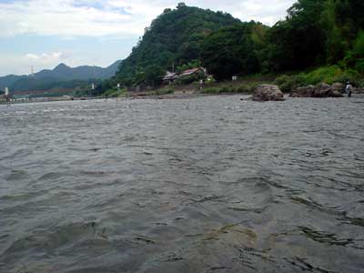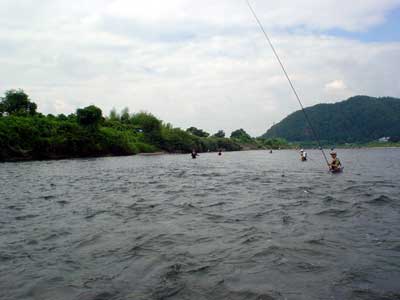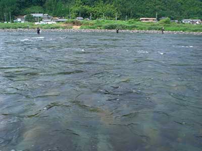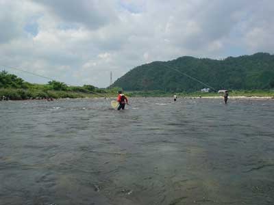 ゆっくりのお昼が終わったのは1時半。片付けをしていると空が真っ黒に。急いで片付け終わった途端に大粒の雨が落ちてきました。風、雷もひどく車内に避難。朝も早かったので爆睡。雨上がったぞーと3時に起こされると川はまた釣り人で一杯です。左岸に渡り軍艦岩周辺を探っていきます。鮎は沢山居るようで上手く泳げば掛かります。特に今回は真下を向いて完全下も竿でおとりを吊り下げるようにすると勝手に横にブレてその時に良く掛かりました。鮎があまり大きくないので真下でも伸されませんでした。今の竿は性能が良いので、グッと堪えていると竿の力で浮いてきます。これでおとりを繋いで午後は21匹。合計28匹でした。前回の板取川よりは随分サイズダウン。さすがに中央の銀座ポイント。竿が入っていないところは無いようです。夕方榎本さんのお友達が潜っていましたが、鮎はムチャクチャ居るそうです。増水後などタイミングさえ合えば爆釣も可能でしょう。前評判通りの長良川です。