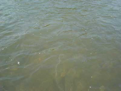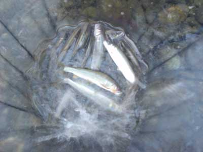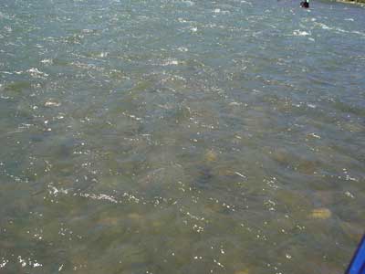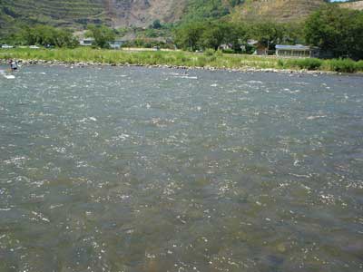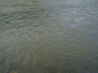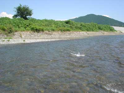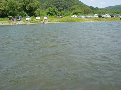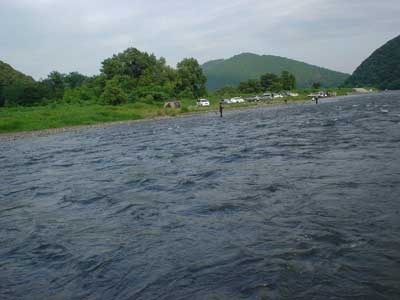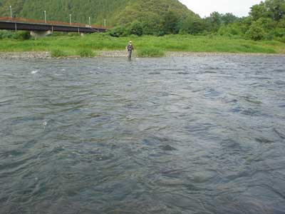 日曜のメンバーは榎本さん、斉藤さん、M田さん、ヒデVさん、春日井の叔父と私。早朝よりやや濁りが増してきました。ゆっくり準備をして8時開始。底石は見えません。昨日よりややグレーな濁り。水温は23度あります。川幅の一番広がっている部分の馬の背に入りました。昨日は1匹目に苦労しましたが、この日は早く掛かりました。そしてモーニングサービスの入れ掛り!これは凄いぞ!と皆を呼びますが9時にはサービス終了。なぜでしょう?入れ掛りになるとどうしてもおとりの扱いが雑になり引き過ぎています。こういう時こそ慎重に、丁寧に扱い、送り出すコースを考えることが大切なのですね。次の課題にします。日曜の濁りはなかなか澄んで来ず、昼でも残っていました。午前中は20匹。