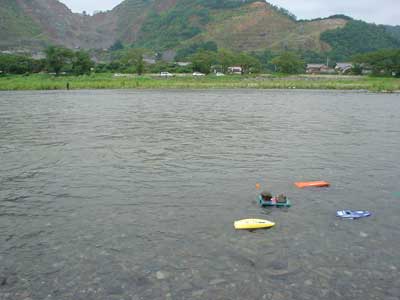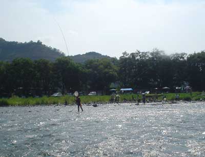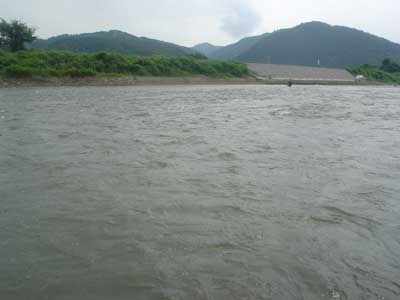 今週末も根尾川です。鮎心会から榎本さん、和人君、斉藤さん、M田さん、三重からヒデVさん、夏は川漁師さん、M岡君と大勢になりました。土曜朝は昨夜のゲリラ雨で濁り&やや増水。川底は完全に泥かぶり状態。濁りが取れかける時に良くなるのでは?と大きな期待をしてゆっくり用意をします。 今回のテーマは引き釣り。おとりを常に自分より下流に置いて管理する釣りを確認です。「オヤジ泳がせ」注)は厳禁!自分より上に上ったら即引き戻し!注)パチスロで適当にボタンを押すのを「オヤジ打ち」と言い、小役を取りこぼします。