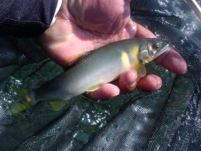 今年根尾の遡上鮎はどうも縄張りが狭い、最初の反応は強いが2度目以降は無視される、弱いおとりは眼中にないなどの特徴があるように感じます。おとりが変わった一泳ぎ目は扇状に横に広く送り出して様子をみます。入れ掛かる時はここで反応します。手前からしっかり竿を寝させて底を泳がせるのが大事。これで反応が出なかった場合はまっすぐ縦に探って行きます。新しい出会いを求めて。このパターンで11時まで19匹。サイズも揃っていました。お昼前に「HP見ていますよ」とMさんという方に声を掛けていただき暫く情報交換。安曇川では束も達成されたそうで良かったです。謙遜されていましたが、基本がちゃんと出来ていないと安曇川でも束は釣れませんよ!
