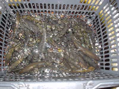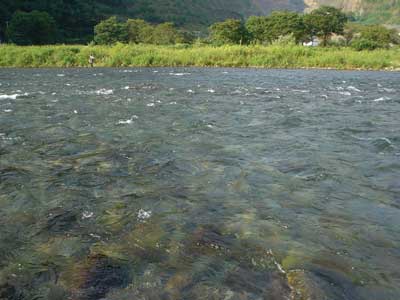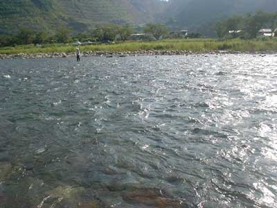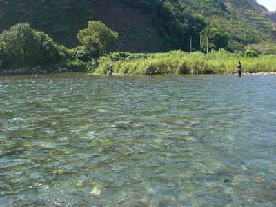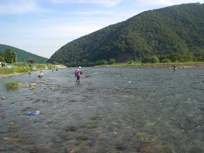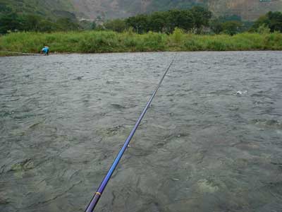 さて朝のポイントは昨日に引き続き下流域へ。狙いどおり瀬尻で良型を5匹確保でき、それを持って昨日泳がせでよく掛かっていたところへ。右岸側にはクラブのM田さん、H尾さん、A山さん、N科さんが並んでいます。さて対面で入れ掛かりでも・・・しかし今日は対岸のA山さんが入れ掛かり!掛かる度に笑うのでうっとおしいこと!やはり糸を立てて泳がせています。 こちらも封印していたナイロンに替えて糸を立てて泳がせてみるとポツポツ掛かりました。が、ラシュランでナイロン、それに良型が掛かるとなかなか抜けません。2回も連続で水面すれすれに飛んできた鮎をタモ枠に引っかけて受け損ない。ナイロンはすぐに封印。複合におもりで、おもりの下で泳がせるように意識してやってみましたが調子は上がらずでした。午前中は13匹。