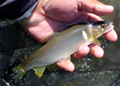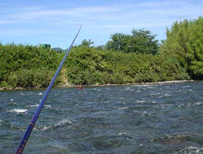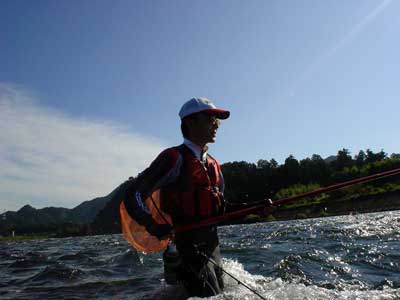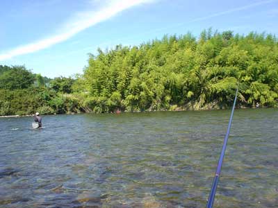 しかし午前中で養殖4匹使用して3匹という体たらく。ランチタイムの後はトロ瀬に入ってみます。腰ほどの深さで砂利混じりの底なので押しが強い。鼻を引かないようにゆっくり探るとブルルとまっ黄色が掛かりますが小さい鮎。3匹掛かるが同サイズ。ここで遠征組は次の場所へ。ビール2本消費のdeibuは移動できず一人寂しく残ります。一挙に空いた瀬に突入。ゆっくり筋を探ると当たりが出始めました。コンディションの良い鮎が掛かってきます。