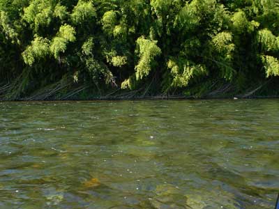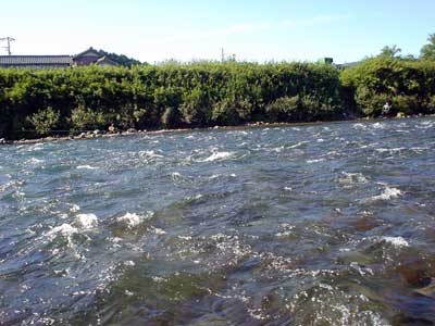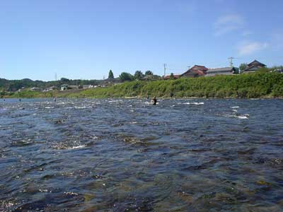 まずは長良川中央区を代表する御手洗(オミタラシ)右岸へ。8時過ぎに入川。石を見ると20〜30cm高い感じ。びっくりしたのはOさん。いきなり瀬を切って左岸へ!胸近くまである流れをものともせず躊躇なく行ってしまうのはさすがの激流隊!もちろんハルさんも腰で波しぶきを上げながら流芯にねじこみ小型?鮎を掛けています。瀬肩に入ったTAKAさんも同様に強い流れを縦横無尽に探っています。この方々「種類」が違うようです。一般種のヒデVさん、こてつさん、Tさんとdeibuはおしりを洗う程度までが限界のウォシュレット隊。4匹用意したおとりの2匹を漬物状態にほどよく変色させてもまだ掛けられず。