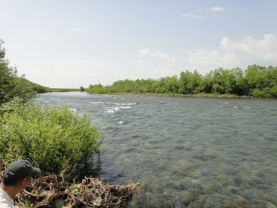 更地堰堤の下流の瀬。全体に石が詰まった平瀬です。背肩右岸側、