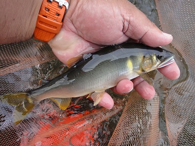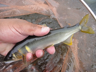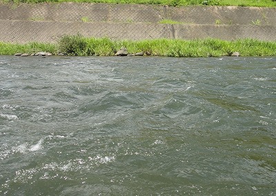 | マスターズ全国大会出場、沢山の方からの電話やメール、川でも声を掛けてもらったりして改めて凄い大会に出られるんだなぁ、と感激しています。全くと言っていいほど気負いはないのですが、権威ある大会に参加させてもらう以上、自分で納得できる大会にしたい。 シード4選手を始め、全国の猛者達との実力差は短期間で埋められるものではないことは自分が一番分かっています。しかし、大自然の中で生き物を相手にする以上、deibuでも全くチャンスが無いわけではないと考えています。その時、そのエリアで、状況に一番合った釣り方をした者が一番釣れるはず。その状況を得た時に自分の力が全て出せるか。その為には時間は無いですが出来うる限りの努力はしておくつもりです。 今回から大会まで、下見に入ります。今回考えてみて気付いたことですが、釣れた時、良かった時のイメージを文章にしておくことで自分に刷り込まれます。経験不足を補うことができます。「鮎の殿堂」を継続していくうち、知らず知らずに予習、実施、復習を繰り返して、回数以上の経験値を得ていたのかもしれません。レコーディングダイエットには失敗しましたが、レコーディング鮎釣りは効果が有ったのかも。 さて今回の下見ですが、大会時にも色々アドバイスを頂いたO月さんと釣友のMさんと3人です。瀬にめっぽう強いO月さんは心強い味方です。大会の予定エリアは名皿部橋から漁協前桃の木淵頭(どこでしょう?)までと書いてありました。 下見ではほとんど釣行経験が無い郡上エリアを重点的にやってみたい。しかし現地に着くと夜半降雨が有ったらしく、東側の谷や支流から濁りが入っています。ドウマンや三本瀬、神路も底が見えない状況でこれでは下見になりません。大和から上は濁り無し。釜淵下流域でやってみます。ここなら薄濁りでも大体の構成が分かっているので傾向は探れます。 今日のテーマは @当たり前のポイント(瀬)で釣れるのか A反応が多いおとりの動き B鮎のサイズと針のマッチング の3つです。まずは瀬肩流芯へ養殖おとりを入れますが、高水で入りません。おとりを替えねば。深トロへ。流れが合わさるY字の股で掛かる。おとりが変わってすいすい泳ぐが掛からず。トロでもオバセを無くして止めて待つと掛かる。次はトロへ流れ込むザラ瀬。白泡の中で簡単に掛かる。流芯は待って掛かる。トロも掛かるが遅い。次は朝攻めきれなかった瀬へ。割と当たり前の所で掛かる。1匹掛かるまでは沢山のポイントにおとりを入れて、おとりが替わったら反応が有った所で待った方が良かった。連日人が多い人気のポイントでも良型が掛かる。このエリアは全体に鮎は沢山いるように感じた。サイズは遡上物の小型から重たい23cm級までバラバラ。最近の郡上は富栄養化しているのか大内山のデカ鮎みたいだ。重いが引きは大したことない。 この日は乱0.04に付け糸0.4号でノントラブルだった。針は一角はバッチリ。忍はケラレが2割弱出た。しかし掛かってからの安心感は忍が抜群に良い。他には6mmワンタッチ鼻管で掛かってやり取り中に1回外れた。7.5mmにサイズアップする。鼻管ハリスの長さ(逆さ〜付け糸取付用結びコブまで)も自分が標準とする21cmでは短いので24cmにする。ポイントとして全体に共通しているのは石頭が出たような瀬よりも比較的フラットに見える瀬で数が出ていた。しかし荒場や、瀬でも頑張って一歩前へ出ると簡単に掛かる鮎も居る。総合的な瀬釣りの技術が試される川の状態です。見ている分にはとっても面白いのではないでしょうか。トラブルは絶対に禁物。それと気になるのはここ最近の不安定な天候です。岐阜では毎日のようにどこかで短時間ですがゲリラ豪雨。簡単に濁りが出ます。もともと水色が暗い感じの郡上が、薄濁りになってしまうとお手上げです。有る程度下見で把握しておかないと短い試合時間では何もできず終わってしまう可能性大。下見可能日数はあと4日間。良く考えて釣行せねば。次回は13日、14日の予定です。 ところで今回、夏らしさが戻って蒸し暑い日でしたが、午後になって瀬で良型が掛かり対応している最中に左足ふくらはぎが攣ってしまいました。その鮎はなんとか取り込んで、下った分戻ろうとしていたら今度は右足も攣った!おしりほどの水深ですが流れも有り立っていられず正面からバッターん!と倒れて5mほど水泳。なんとか立ちましたが水中でタモから悠々と逃げ出す釣りたての良型鮎を見た時はショックでした。 なぜかしら今年は良く足が攣る。帰ってから調べると疲れや冷やすのが原因ですが、もう一つ、汗をかいて血液中の電解質のバランスが崩れることも大きな原因のようです。熱中症の症状ですね。昨年まではスポーツ飲料を携帯して1日1リットルは飲んでいましたが、今シーズンはカロリーとコスト削減のため緑茶にしていました。これがダメだったようです。次回からはまたスポーツ飲料に戻して塩飴も携帯して万全を期しま