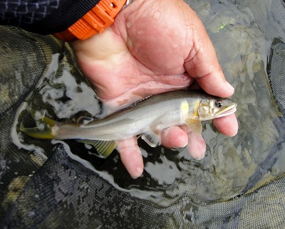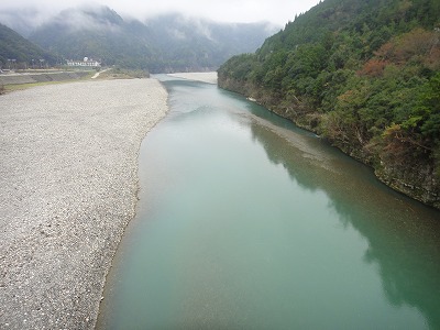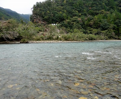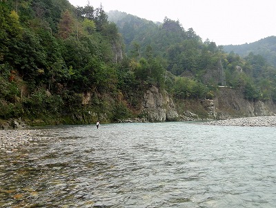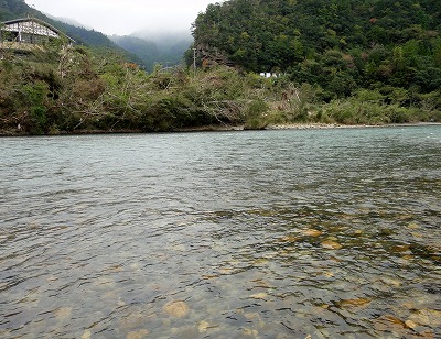 | なぜか竿を納める踏ん切りのつかない今シーズン。静岡の興津川まで行ってじゃじゃまるさんたちと納めるつもりをしていましたが、前日朝、Hさんからの1通のメールで心が動く。メールの内容は至ってシンプル。「北山まだまだ釣れますよ。」なに?できるの?Hさん、今年シモツケを制したM川さんや森岡名人たちと行動を共にする瀬釣り名手です。Hさんも熊野中毒患者の一人。deibuの気持ちも分かっていたのか!ここ3年は熊野・北山で納竿をしていますが、今年は無理かなと諦めていました。しかしdeibuが行くならHさんも行ってくれるということで、これは行くしかないでしょ!天気予報はいまいちですが、一応土日できる装備で挑みましょう。 北山川、例年ならまだおとりも置いてある時期ですが、今年は台風で終了しています。メールをくれたHさん、前回はガリで簡単に採れたから大丈夫!と心強い。おとり獲りがあるので早めの出発。打ち合わせは簡単、現地へ8時!これでOK!予定より早めでしたが熊野には同時に到着していました。 瀞流荘前、橋上から川を見るとかなり濁りが取れて川底が確認できるくらい。石色も良し!これはワクワクします。もちろん釣り師の姿は無し。まずはおとり獲り。Hさんに託しますが、deibuも一応協力しようと用意してきました。9年前に頂いた仕掛けと算盤おもり。竿はエギング用中通し竿です。今回で2回目のガリ挑戦のHさん、手こずっています。deibuも初めてでワケも解らず投げるだけ。30分も過ぎたころでしょうか。初めての反応が!掛かってる!16pほどですが背掛かり!もう1匹ほしいですが、算盤おもりが無くなりあえなく終了。Hさんはまだガリ竿を振っていますが、先にこの1匹でやってみます。 ジェット船も運休中なので航路を掘ってありません。どこでも川を横断できる。石色は最高!流芯は少し白っぽく見える。願いを託しておとりを流れへ。馴染んだと思ったら即ググン!ん?動かない。上げると掛かってる!アユカケでした。再投入。落ち着くところで待つ。掛かった!反応が多い。3匹掛けておとり確保完了。Hさんも開始。いきなり入れ掛かっています。やはり白っぽいところでは反応がない。やや手前、瀬の掘れ込みや大き目の石廻りが良い。そういった場所できれいに泳ぐと掛かる。そんなピンポイントを広い流れから探し打っていくのでそれほどのペースでは掛かりません。でも居るところではビンビン反応が出てまっ黄色で掛かるので最高です。オスでもぬるぬるでまだいい匂いがします。午前中は17匹。Hさんも同じ程度。少し下流で両型連発だったそうでにっこりです。 午後も同じ場所で。両型ポイントがまだ攻めきっていないのでその周辺を重点的にやってみます。やや大き目の石が多いざら瀬ですが、底の変化が多くそこに鮎が着くようです。ここはサイズが良い。18〜20pクラスも掛かり最高!3時半ころまでやって11匹でした。 この日は曇り、午後雨でしたが、寒くなく、水もそれほど冷たくない。3時を回ると追いが無くなりましたが、お昼を挟んだ時間帯は活性高くとても11月を感じない日でした。比較的水位が低かったこと、航路が掘ってないことで縦横無尽に動けて広く探れるので面白かったです。 途中地元の方が一人だけ竿を出していました。この方は投網で簡単におとり確保。うらやましい。Hさんは用事で帰宅。誰もいない広い河原で雨に濡れながら着替え。瀞流荘で温泉に入り明日はどうしようかと考えていましたが、露天風呂からさっきまで釣っていた川を見るとオレンジのおとり缶だけがポツリと見えます。なんとも寂しい限り。温まったらみかんを買って、途中おいしいものでも食べてゆっくり帰るか。 鮎を全て放流して帰路に付きました。途中時計を見ると関所の閉門までに間に合いそう!関所「一冨士」さんで中華そば頂いてこれで納竿できました。やっぱりこうでなければ。 瀞流荘周辺は先の台風での建造物への被害は比較的少なかったようですが、川の両側には高い所まで濁流の爪痕がありました。少し下流へ行けばまだまだ復旧の真っ最中。熊野へ行くのは少し気が引けましたが、最後に行けて良かったです。被害も甚大ですが、それ以上に回復する力を持っていると感じさせる熊野。最後に楽しませてくれて感謝です。 ところで北山川ですが、鮎はまだ若く、今月中ごろまでは間違いなく楽しめそう。ほとんどの場所が更場です。人の手が入っていない本来の流れと野生の鮎を楽しめる貴重な一時かもしれません。仕舞った道具をもう一度濡らす価値が十分あると思いますよ。浅場にも沢山いたので投網の権利が有る方なら簡単に確保できると思います。ガリでも経験者なら簡単かも。 さて今年の鮎はこれで終了です。釣った数は昨年よりガタ落ちですが、得るものが多かった年でした。近いうちに今年のまとめを書き記します。海は釣れたら記事を書く予定。気が向いたら覗いてください。今シーズンもお付き合いくださりありがとうございまし