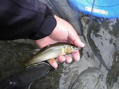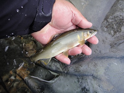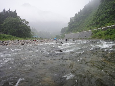 | いよいよ本陣の解禁です。昨年に引き続き斉藤さんと板取上流、郡上解禁の長良川水系満喫コースです。矢島さんで待 ち合わせ、雨模様なので川を見ながらゆっくり行きます。今回の狙い場所は「専用区」です。夜半からの雨は止む様子がありませんが、水位は平水ほどになって濁りは全くありません。釣り人は少なく、局所にまとまっている感じ。 岩本辺りまで来て専用区で荒い瀬が空いていました。少し上のプールは昨夜からの待機組がみえましたのでここなら鮎も見えたのだろうとここでやってみることになりました。車の方向転換で少し上まで行くと専用区上限に川へ降りやすいところがあったのでそこへ停めましょうと少し移動。これが間違いでした。結局良かったのはその荒い段々瀬でした。降りやすい所は良いザラ瀬だったのですが昨日までは渇水で鮎が付いていませんでした。その上の吊橋付近も同じで付き鮎は居ません。 掛かったのは深く荒く水通しの良い場所。斉藤さんは最初吊橋付近から上を探ってダメだったので段々瀬へ来てそれから20匹ほど掛けていました。deibuは最初ザラ瀬から少し荒い所に変わる辺りで竿を出し、すぐに良型2匹掛かって、同じ所では続かなかったので、まだ動けるうちにここと思う所をピンポイントで探って行った方が良いと思い動いたのが失敗でした。暫くしてから段々瀬に行った時には下流でお二人が良いペースで掛けていました。この辺りで5、6匹掛かりましたが石の間に吸い込まれ3匹埋め込み。そしてウエットタイツに雨で寒くて仕方なかったので10時に上がり。残ったのは5匹だけでした。途中イワナみたいなのが掛かってきましたが少し変な感じ。後で斉藤さんに見てもらうとブラウントラウトという魚だったようです。どこかの養魚場から逃げ出した魚のようです。しかし解禁で5匹とは情けない。ポイント選定が間違っています。郡上はどうなるのか。 |
