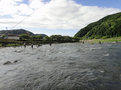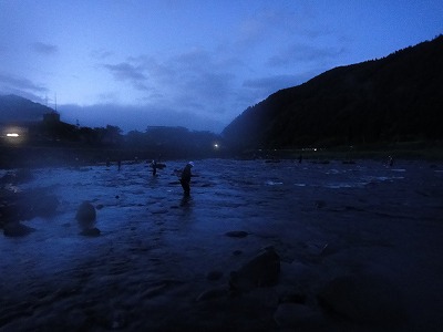 | 板取温泉で暖まってから早々に郡上へ移動し、稲荷辺りから川を見ながら上流へ。翌週は早くもマスターズなので斉藤さんの下見も兼ねて大会エリアでやってみる予定です。川は薄っすら濁りが入っていましたが橋から覗くと鮎は結構見えました。食材を買い出ししてこの時点では人が少なかったウインドパーク広場へ行きました。ここなら鮎が居ないことはないので安易に決定。夕方になると知った方々が続々と集まって来てあっという間に満車状態。2時起きだったので9時に電池切れで就寝です。 夜中の3時を回ると周りがざわつき出します。郡上の解禁らしき風景です。川には早くも釣り人の姿が影になって確認できます。4時過ぎに川へ。絞り込みの瀬が良いかとかなり迷いましたが、平場の方が長く釣れるのではないか?とスケベ根性で支流合流点付近へ。4時半スタート。鮎の活性は低く10時頃までにポツリポツリと10匹程度。型も小さい。立っていたエリアは思ったほど水深が無く、膝程度。所々にあるモモ程度の掘れ込みで少しだけ掛かる感じでした。石色もイマイチ。瀬では入れ掛かりになっていました。それも良型ばかり。 ゆっくり休憩し午後は空いた場所で竿を出しますが浅い場所は極端に反応が悪い。瀬が空いたのでやってみると反応は良いものの小型ばかり。すっかり抜かれた後なので仕方ありません。ウロウロしてポロポロ。5時近くまでやって19匹だけと不甲斐ない結果に。人が歩きまわる所は完全にOUT!でした。渇水で神経質だったはずの所に沢山の釣り人。そりゃ鮎も怯えるでしょうね。こんな厳しい中でも斉藤さんは30匹近く。斉藤さんは自分より上でおとりを泳がせることは全くありません。必ず竿下におとりを置いて完全にコントロールしながら丁寧に釣っています。絶妙なテンションコントロール。身近な名手の技はもっと見習うべきです。この日にこんなことがありました。午後からダイワのI名人が釣りを始めました。如何な名人でもさすがに浅場では厳しいようでした。瀬でポツリポツリと掛けている斉藤さんを座り込んで見ています。斉藤さんは今年I名人開発のSMT(スーパーメタルトップ)を使っています。その辺りの感触を聞いていたかどうかは定かではありませんが、I名人でも認める技術なのでしょうね。凄いです。 さて今回の2日間は良いとこなし。反省点は山ほどです。第一はポイント選び。渇水だったことを考えていたつもりでしたが実際の立ち位置はベストではなかった。解禁だとどうしても竿を入れていないポイントが気になって操作が雑になってしまいます。ここが斉藤さんと同じ場所でやっていて差が出てしまう要因のようです。しかし今年は釣れない。どうやって修正しようか。 |