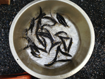 村上おとり店前の瀬右岸に立ちました。左岸側が本筋になっていますが、右岸足元もきれいになっています。細かい流れを一つずつ丁寧に。手前を探ってから沖へ。そうやって徐々に釣り下がり、石の荒いところでは糸の角度をいろいろ変えてみたりして50mほどの瀬を3時間かけてみっちりやりました。ここでは19匹。今までだったら掛けられなかった鮎を掛けた感じがして満足です。この瀬では平均中型が多かったです。午後はそこから下流へ。おとり店下の護岸ブロック前から。良い流れですが1回ケラレただけで掛けられず。下のザラ瀬、その瀬落ち開きを探るも1匹も掛けられず。2時間ぼうず!これはいかん。水管橋にはマイクロバスが止まっていて沢山の釣り人が居ましたが、どうも終了のようです。一気に無人に!人気ポイント水管橋、午後3時に無人です。まだやったことのない場所ですがやらなきゃ損損!良型が調子よく掛かりました。ここも丁寧に探って2時間15匹。18〜21pでマッ黄色ばかりでした。反応も薄くなったので帰ろうかなと戻ります。おとり店周辺もすでに無人。気になっていたテトラ前をもう一度探る。20分やってゼロ!終了にしました。午後は人の動きのおかげで掛けられましたが、そうでなかったら撃沈でした。浅い、緩い流れでも鮎は居たので、それを掛ける技術が欲しい!まあ、今回はテーマを検証できたので良かったです。渇水で石も良く見え、流れも把握しやすかったので攻めやすかったですが、これが水が多いとどうしても雑になってしまいがち。今度は長良川で試したいです。今回はカメラを忘れたので釣り場の写真がありません! |