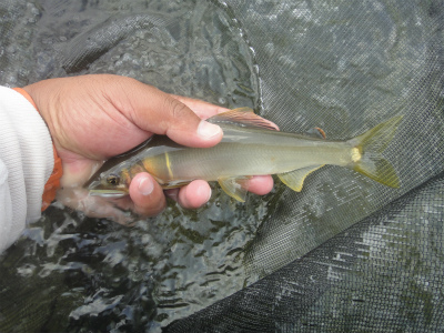 | 九頭竜川3回目。この日はお昼までだったので、前回同様五松橋付近へ入って、前回からどう変化したのかを中心に探ってみました。おとり店に行くと「祭りは終わったよ」とのこと。前回14日、15日は高水がやっと落ち着き、新垢付き出した絶好の時でしたので当然と言えば当然か。ですが、水位は今で平水とのこと。少しは釣り人も少ないかなとわずかに期待して釣り場へ。 最初は福松大橋上流の瀬へ行ってみました。橋時高圧線の下にある長いザラ瀬から平瀬〜浅いトロになる場所。五松橋下流の大トロからの瀬になります。前回の結果から、水深があるところで良型が出たので、瀬落ちからその平瀬をメインに狙って開始。6時半で一番乗りでまだ誰もいません。瀬落ちの石色はまだイマイチ。九頭竜川は場所によりすでに垢腐れみたいなところ、石色ピカピカのところ、白っぽいところと色々。そして水の色の加減か、日が差していないと石色が悪く見えます。手前のやや浅いところから差して沖へ斜めに探っていきます。股下程度の流れに入ってから反応が出る。掛かりましたが小さい。釣り人も出てきたのでどんどん下がって探りを入れていきます。平瀬にかけてどこでも反応でますが良型はいない。目いっぱい立ち込んで沖を探っても一緒です。それに朝一は少し反応が弱いです。あっという間に7名ほどの団体さんに囲まれて身動き不能。下の激流肩を狙いに行くも10m下に入られて嫌になります。分流も見に行って結局1時間半で5匹だけ。全部15〜16pです。移動。 前回入った鳴鹿大堰下流の中州地帯へ。まずは前回良型が連発した深トロへ。水位はあまり下がった気がしません。すぐに1匹掛かるが白い鮎。前回同様足元にも良型鮎が見えますが追わない。1時間1匹!こりゃいかん。前回一番数が出た中州地帯へ。前回は釣り人が多く差せなかったところへ。最初から入れ掛かり。浅いところですが石色良くサイズも18〜20pが出ます。流芯はイマイチですが、流芯に立って探れるところで連発します。釣り人が立つところ。200mほど上の瀬肩へ移動します。ここではやや小ぶりながらも爆発的に掛かる。しかし少しずれると当たりが遠くなる。ここで良かったのはザラ瀬の中の水深があるプールみたいなところでした。ザラ瀬は垢腐れみたいに見えました。残り1時間になったのでやっぱり気になる深トロ再挑戦!10時以降はどこでも良く掛かっていたので時間の加減もあるかなと思い確認です。胸まで入っておとりを入れると朝と全然違う反応。これは掛かるな。掛かった!デカい!22〜3あるデカ鮎でした。それをおとりにすると魚雷みたいに突進していきます。同じおとりで5匹掛かる。ですが2回はハリス切れ。おとりがデカいと掛かった時に抵抗が大きいからかハリス切れのリスクが高まりますね。掛かる鮎のサイズではなく、おとりのサイズがデカい時はハリスの止め方要注意です。まだまだやりたかったのですが時間になったので終了。32匹でした。23p1匹、18〜20p級が10匹、残りは13〜16p級でした。朝瀬、昼トロの基本形。追いは強く面白い。この日も針は15本ほどと自分としては大量消費。自覚したケラレは2回だけ。今さらながら針って大切ですね。 |