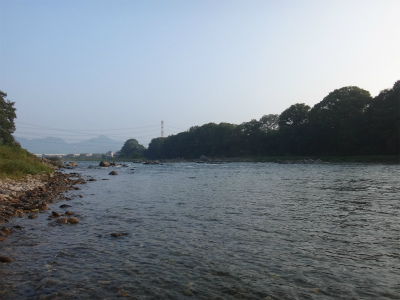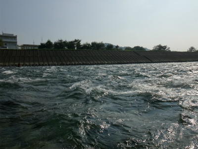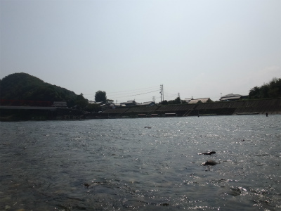 鮎の瀬の瀬肩。この日は湿度もあり、暑かったです。水位が下がると網打ちの方が毎日来るので、鮎は怯えているようです。 |